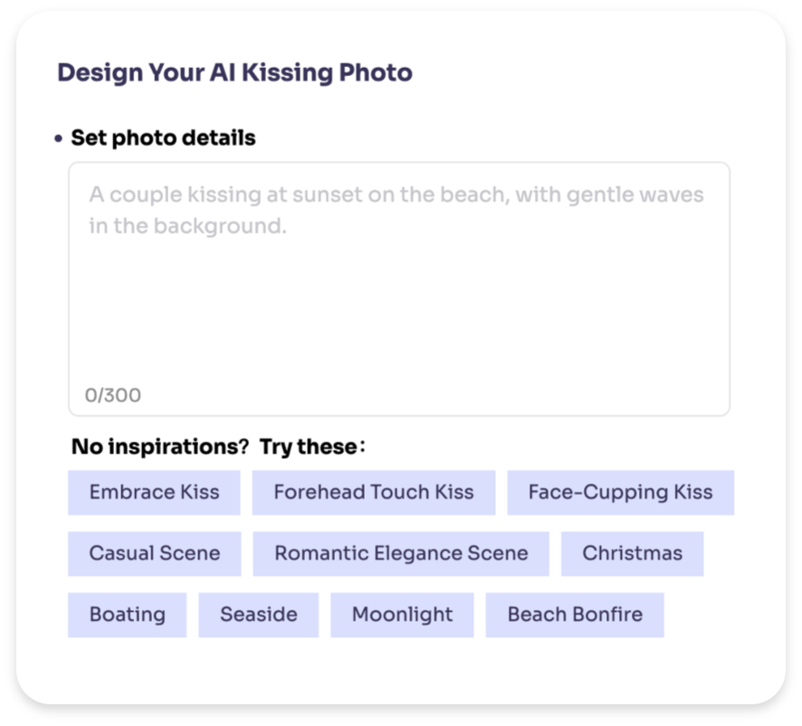 للبدء، صف صورة القبلة التي ترغب بها في بضع جمل. تذكر أنه كلما وصفت الصورة بدقة أكبر، زادت رضاك عن الصور.